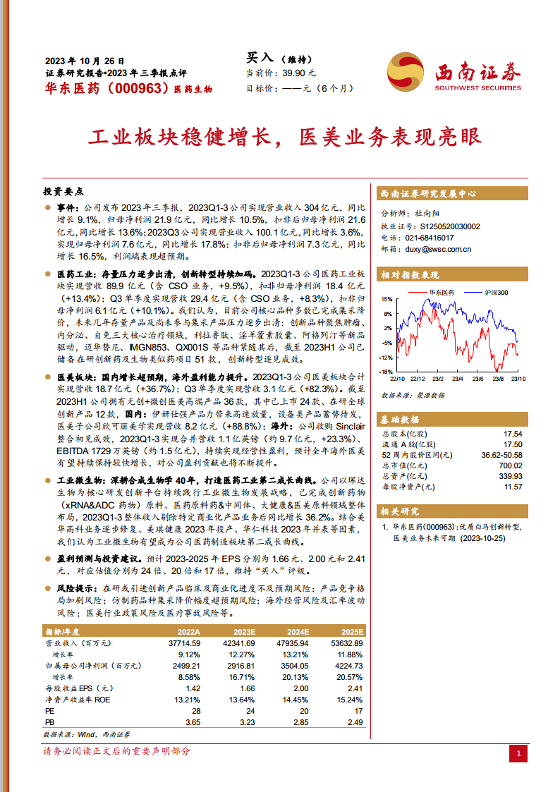 华东医药在2023年前三季度展现出强劲的业绩增长势头,尤其在第三季度利润端表现超预期。公司通过医药工业的创新转型、医美业务的国内外市场高速扩张以及工业微生物板块的战略布局,成功构建了多元化的增长引擎。医美板块的亮眼表现和工业微生物作为第二成长曲线的潜力,为公司未来发展注入了强大动力。尽管面临创新产品商业化、市场竞争、集采降价、海外经营及政策等风险,但公司清晰的战略方向和持续的创新投入,使其具备良好的长期增长潜力。基于此,报告维持了对华东医药的“买入”评级。