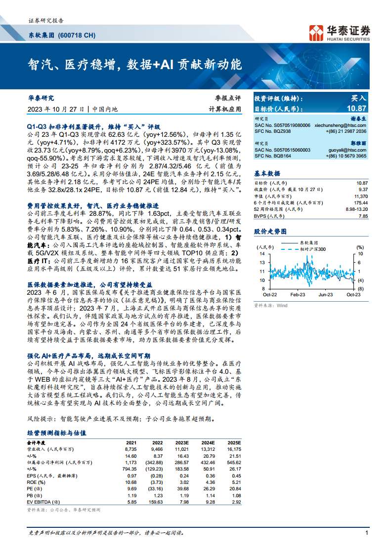 东软集团2023年前三季度营收实现12.56%的同比增长,其中扣非净利润同比大幅增长323.57%,显示出公司核心业务的盈利能力显著提升。尽管第三季度归母净利润有所下滑,但考虑到下游需求复苏放缓,华泰研究对公司未来盈利预测进行了调整,并基于分部估值法维持“买入”评级,目标价调整至10.87元。