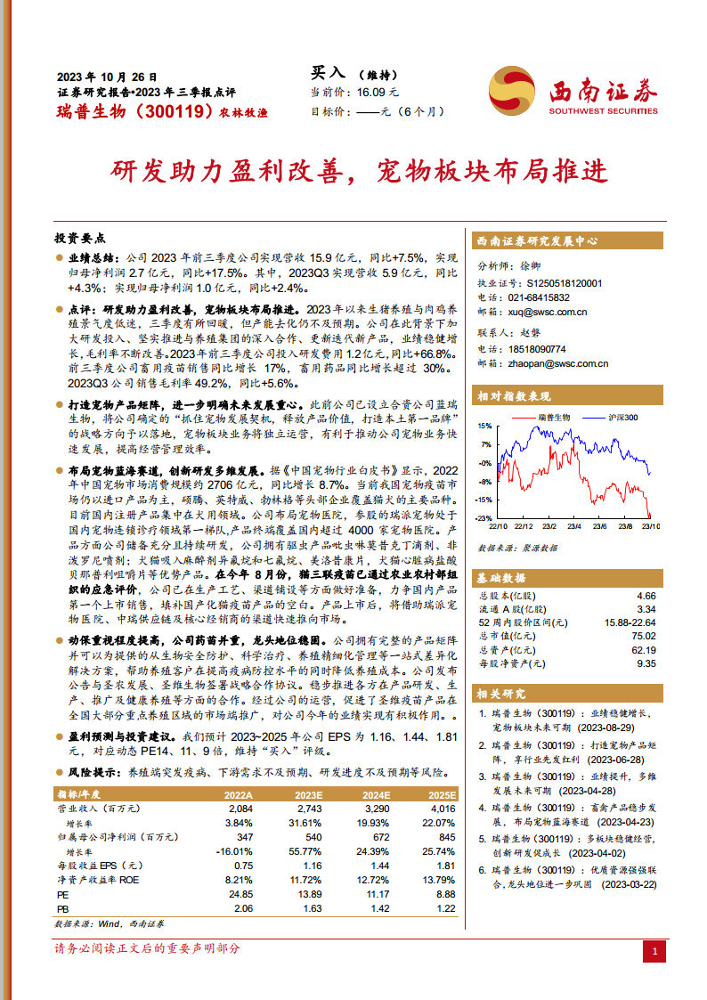 瑞普生物(300119):研发助力盈利改善,宠物板块布局推进