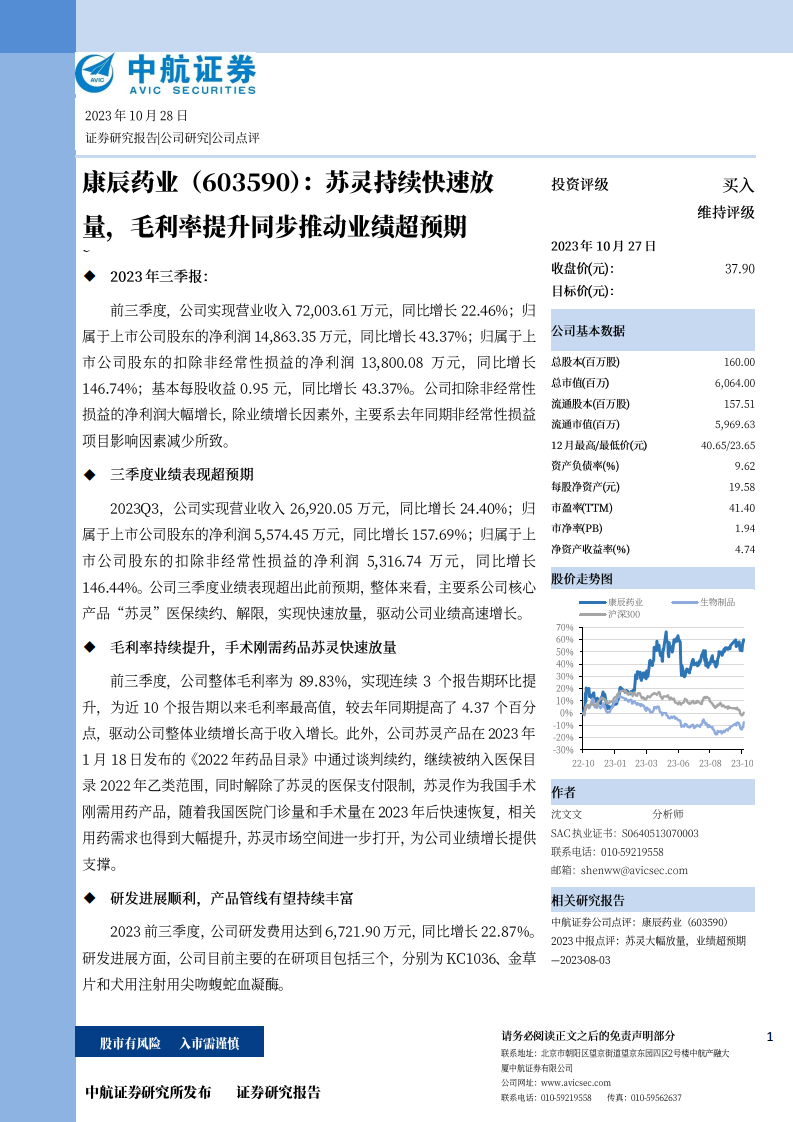康辰药业(603590):苏灵持续快速放量,毛利率提升同步推动业绩超预期