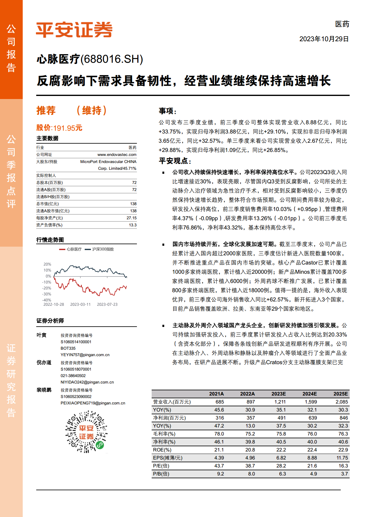 心脉医疗在2023年前三季度展现出强劲的经营韧性和高速增长态势,营业收入和归母净利润均实现近30%的同比增长。这主要得益于其在主动脉介入治疗领域的需求韧性,以及公司在国内外市场的持续开拓和创新研发的坚定投入。公司在国内市场深度渗透,医院覆盖和产品植入量持续增长;国际业务加速发展,海外销售收入实现超60%的增长。同时,高比例的研发投入保障了多条产品线的顺利推进,为公司未来发展奠定基础。尽管面临政策、集采等潜在风险,但公司凭借其在主动脉及外周介入领域的龙头地位和持续创新能力,预计将继续保持稳健增长,因此维持“推荐”评级。