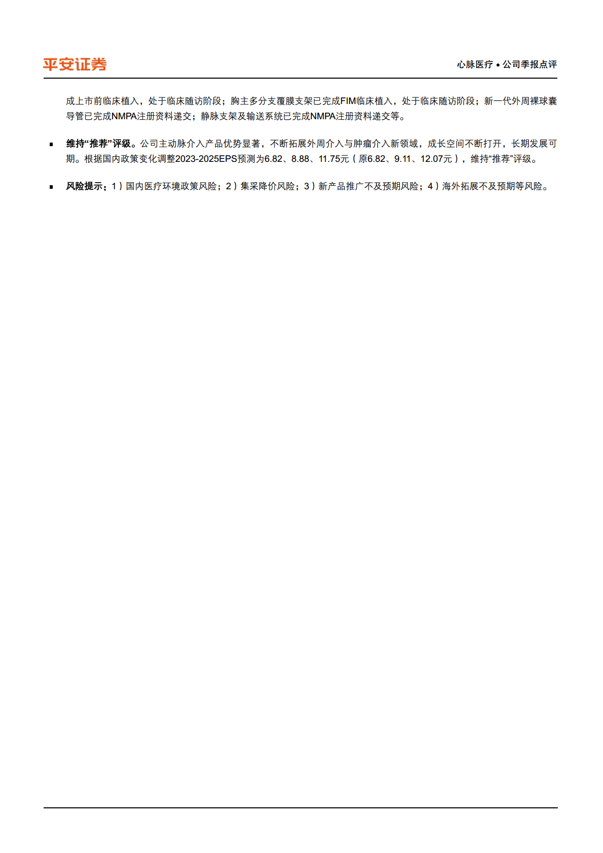平安证券维持对心脉医疗的“推荐”评级。公司在主动脉介入产品方面优势显著,并通过不断拓展外周介入与肿瘤介入等新领域,持续打开成长空间,长期发展可期。根据国内政策变化,平安证券调整了公司2023-2025年的EPS预测分别为6.82元、8.88元和11.75元(原预测为6.82元、9.11元、12.07元),尽管略有调整,但仍保持了稳健的增长预期。