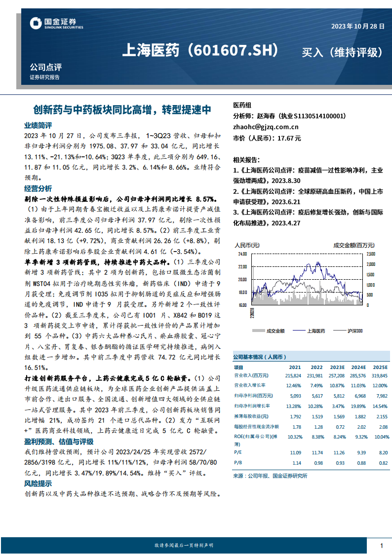本报告核心观点指出,尽管2023年前三季度公司归母净利润受一次性特殊损益影响出现同比下降,但剔除该因素后,归母净利润实现8.57%的稳健增长,且第三季度单季业绩表现符合预期,营收和净利润均实现同比增长。这表明公司在核心业务层面保持了良好的增长势头。同时,公司正积极推进战略转型,聚焦创新药研发、中药大品种培育以及医药流通服务升级,以构建多元化的增长引擎。