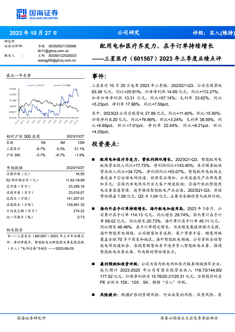 2023年三季度业绩点评:配用电和医疗齐发力,在手订单持续增长