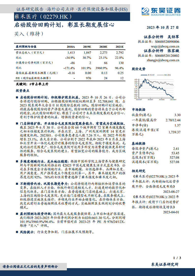 报告维持对雍禾医疗2023-2025年的归母净利润预测,分别为0.02亿元、0.66亿元和1.30亿元,同比增速分别为101.9%、3960.9%和96.4%。当前市值对应2023-2025年PE分别为976倍、24倍和12倍。鉴于公司作为国内最大的毛发服务提供商,其渠道加速扩张和内部精细化运营的持续推进,分析师维持“买入”评级。