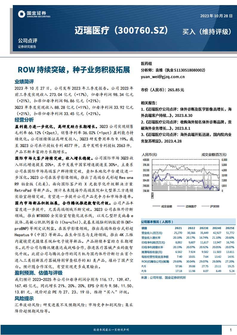 迈瑞医疗(300760):ROW持续突破,种子业务积极拓展