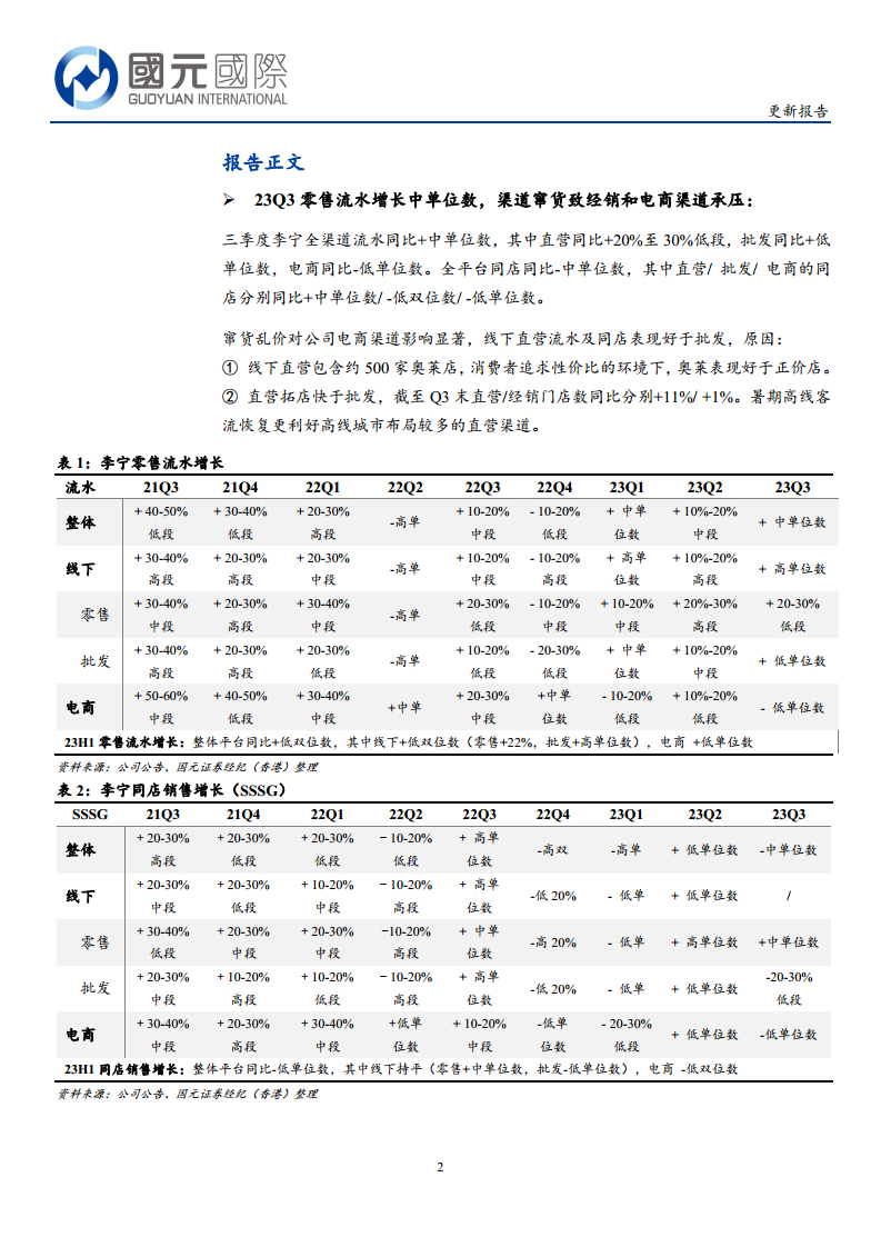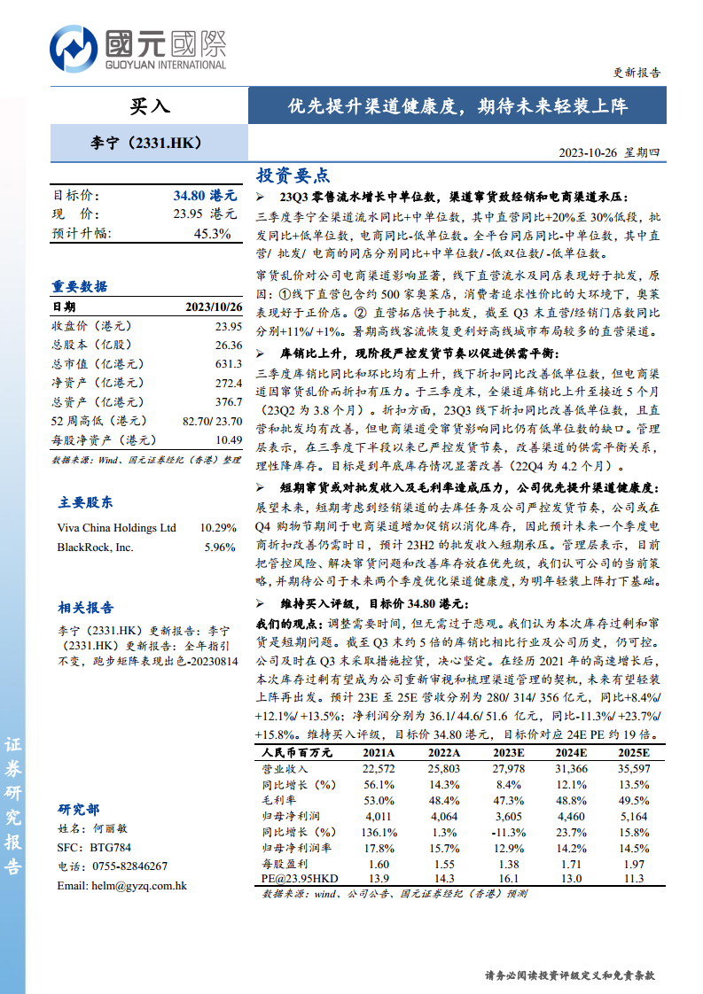 李宁在2023年第三季度面临零售流水增长放缓、渠道窜货导致电商和批发渠道承压以及库销比上升的挑战。公司管理层已积极应对,通过严控发货节奏、优先解决窜货和库存问题,致力于提升渠道健康度。尽管短期内批发收入和毛利率可能受压,但分析师认为这些问题是暂时的且可控的,并视之为公司优化渠道管理的契机。基于对公司战略调整的认可及未来营收和净利润的增长预期,报告维持了李宁的“买入”评级,目标价34.80港元,展望公司在未来两个季度优化渠道健康度后,能够实现轻装上阵并持续发展。