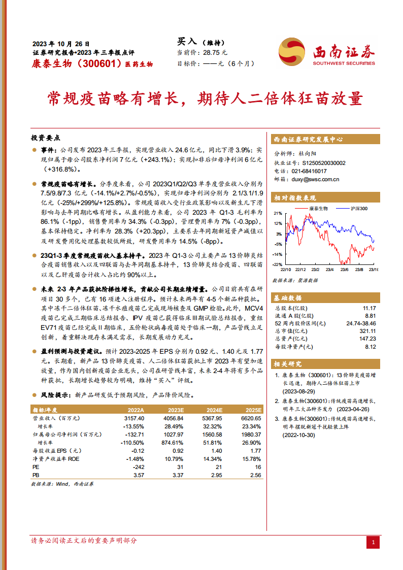 康泰生物2023年三季报显示,公司在营收略有下滑的情况下,归母净利润和扣非净利润实现大幅增长,主要得益于去年同期基数较低。常规疫苗业务保持稳定,核心产品贡献突出。公司拥有丰富的在研管线,多款创新疫苗有望在未来2-3年内获批上市,为长期业绩增长提供强劲动力。西南证券维持“买入”评级,并预测未来几年盈利能力将持续提升,但提示投资者关注新产品研发和产品降价风险。