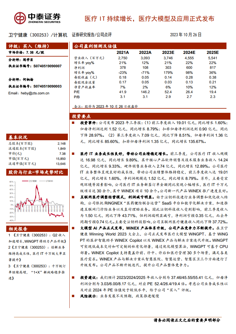 卫宁健康在2023年前三季度表现出稳健的经营韧性,核心医疗IT业务持续增长,为公司业绩提供了坚实支撑。尽管互联网医疗业务收入有所下降,但通过经营模式调整实现了显著减亏,优化了整体盈利结构。尤其值得关注的是,公司正式发布了医疗大模型WiNGPT及其应用WiNEX Copilot,并全面升级了WiNEX产品体系,这标志着卫宁健康在医疗AI领域迈出了重要一步,显著提升了其产品竞争力,并为未来在智慧医疗领域的拓展奠定了基础。分析师基于对公司业务成长性和估值水平的判断,维持了“买入”评级,但同时提醒投资者关注业务发展和政策推进可能带来的风险。整体而言,卫宁健康正通过核心业务的稳健发展和前沿技术的创新应用,积极应对市场变化,并有望在医疗信息化和智能化浪潮中实现持续增长。