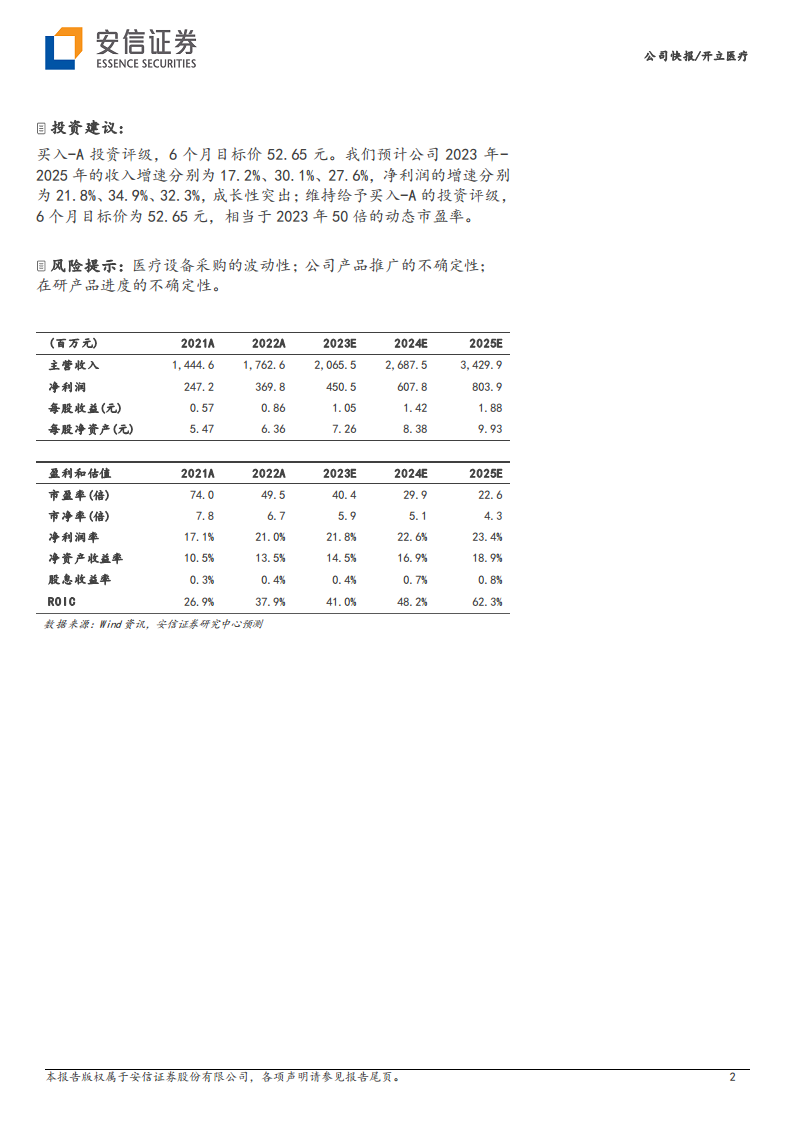 内镜业务被视为公司中长期持续增长的核心驱动力。在国内市场,预计2022年至2032年消化内镜配置量将从2万台增至6万台,软镜市场规模将从85亿元扩大至230亿元,显示出巨大的市场潜力。开立医疗在2023年上半年软镜市占率约为7.4%,近三年累计提升约5.5个百分点,表明其产品竞争力强劲且市场份额仍有显著提升空间。长期而言,海外销售也将成为内镜业务新的增长极。基于此,报告维持“买入-A”投资评级,并设定6个月目标价52.65元,预期公司未来几年收入和净利润将实现高速增长。
