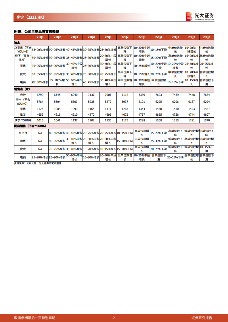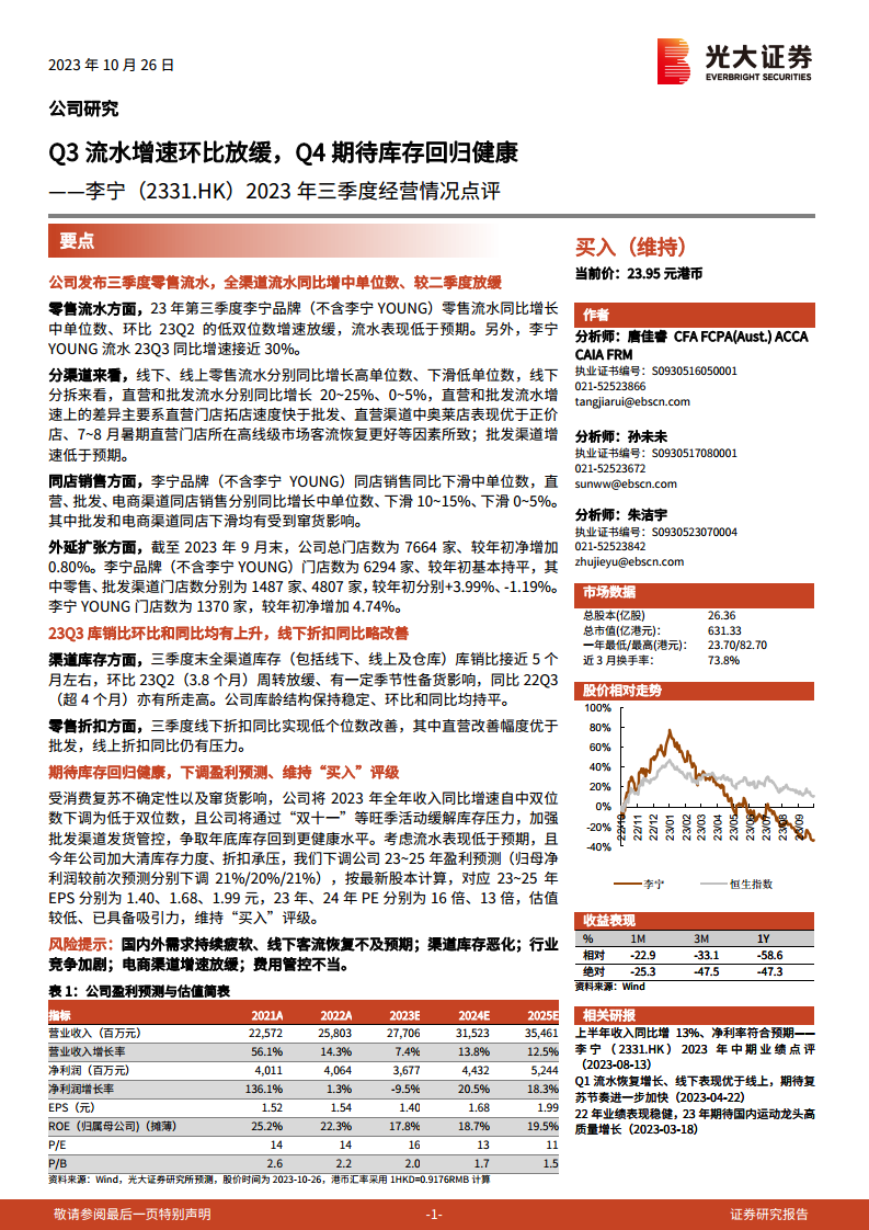 鉴于当前经营状况和市场不确定性,公司已下调2023年全年收入增速预期。光大证券因此下调了李宁2023-2025年的盈利预测。然而,分析师认为公司将通过“双十一”等旺季活动及加强渠道管控来优化库存结构,且当前估值已具备吸引力,因此维持“买入”评级。