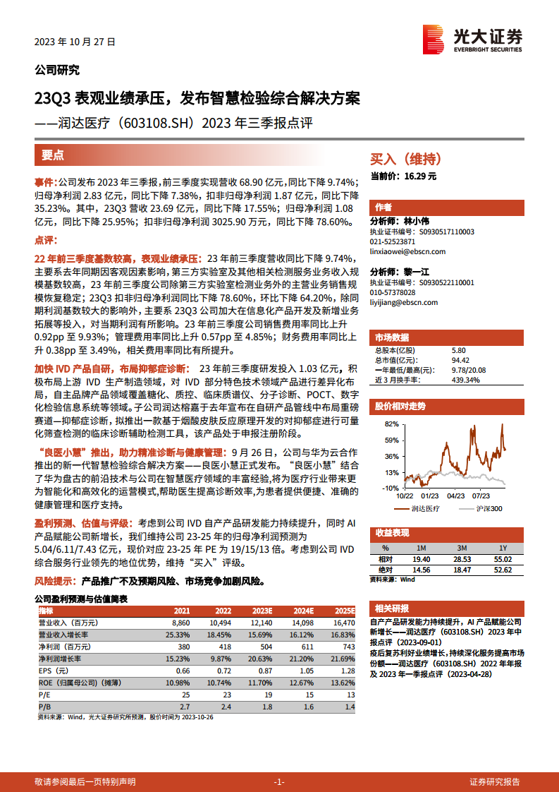 润达医疗2023年第三季度及前三季度业绩受高基数和战略投入增加影响,营收和归母净利润同比有所下降,特别是扣非归母净利润降幅显著。然而,公司正积极应对挑战,通过加大IVD产品自主研发投入(前三季度研发投入1.03亿元),拓展自产品牌线,并布局创新诊断领域(如抑郁症诊断工具),以提升核心竞争力。此外,与华为云合作推出的“良医小慧”智慧检验综合解决方案,利用AI技术赋能医疗运营和精准诊断,有望成为公司未来业绩增长的新动力。分析师维持公司2023-2025年归母净利润预测,并基于其行业领先地位和创新战略,维持“买入”评级,但提示了产品推广和市场竞争风险。