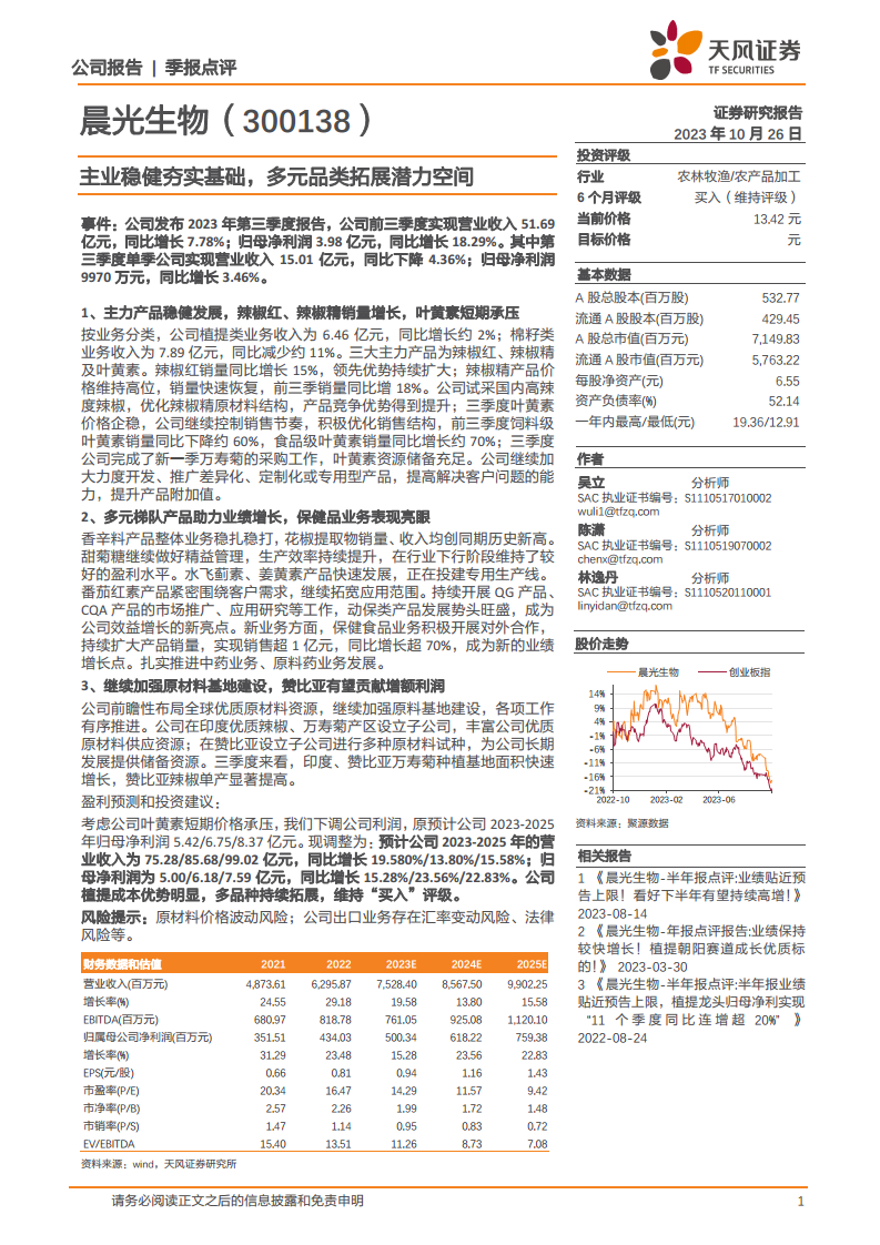 晨光生物2023年前三季度业绩表现稳健,归母净利润实现18.29%的同比增长,显示出良好的盈利能力。公司主力产品辣椒红和辣椒精销量增长强劲,同时通过多元化产品布局,特别是保健食品业务的显著增长,有效对冲了叶黄素短期价格承压的影响。公司持续推进全球原材料基地建设,在印度和赞比亚的布局将进一步巩固其成本优势并为未来增长提供保障。尽管短期内叶黄素价格面临压力,但凭借其在植提领域的成本优势和多品种拓展策略,公司未来业绩增长潜力依然可期,分析师维持“买入”评级。