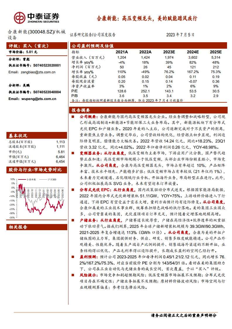 综合来看,合康新能的基本面在美的集团入主后持续改善,战略布局日益清晰,工业自动化与光储业务的成长空间巨大。尽管面临市场竞争加剧、业务拓展不及预期以及原材料价格波动等风险,但公司在美的集团的助力下,有望实现营收和利润的快速增长。预计2023-2025年归母净利润将分别达到0.45亿元、1.21亿元和2.12亿元,对应当前股价的PE分别为143倍、54倍和31倍,展现出显著的成长潜力,因此给予“买入”评级。