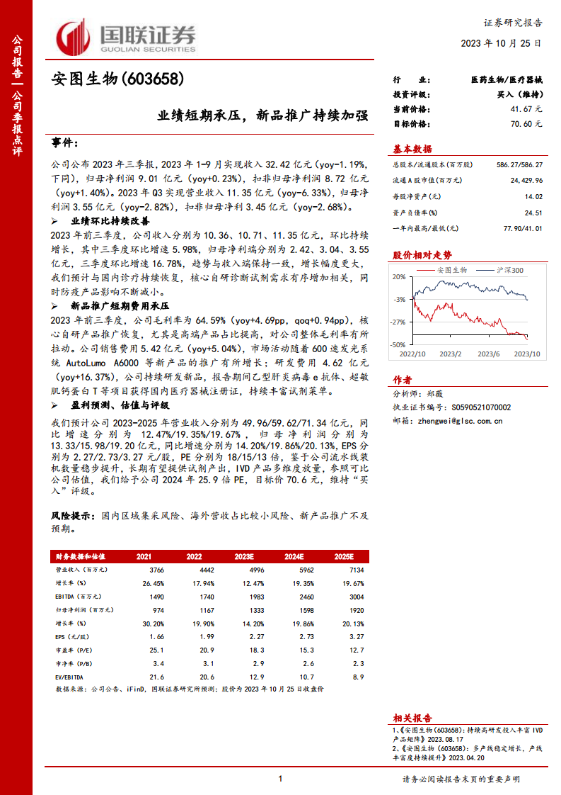 安图生物2023年前三季度业绩表现出短期承压与环比改善并存的特点,尤其第三季度收入和净利润环比增速显著。公司通过加大新品推广和研发投入,提升了毛利率,并持续丰富产品线。分析师基于对公司未来流水线装机和IVD产品放量的预期,维持“买入”评级,并给出了积极的盈利预测和目标价。尽管存在市场竞争和新产品推广等风险,但公司在核心业务领域的持续投入和市场拓展有望支撑其长期增长。