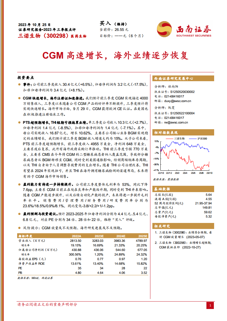三诺生物在2023年前三季度实现了稳健的收入增长,扣非归母净利润表现尤为突出,显示出核心业务的强劲势头。CGM业务的高速增长和海外市场拓展是公司未来业绩增长的核心驱动力,已获得欧洲CE认证并积极推进美国注册。尽管短期内毛利率因CGM产能爬坡和THI并表而承压,且THI业务面临亏损,但随着CGM产能提升、自动化投产以及THI公司治理的改善,预计公司盈利能力将持续提升,THI也有望在2024年扭亏并助力CGM海外销售。分析师维持“买入”评级,并对公司未来盈利能力持乐观态度,但提醒投资者关注CGM放量和海外研发进展的潜在风险。