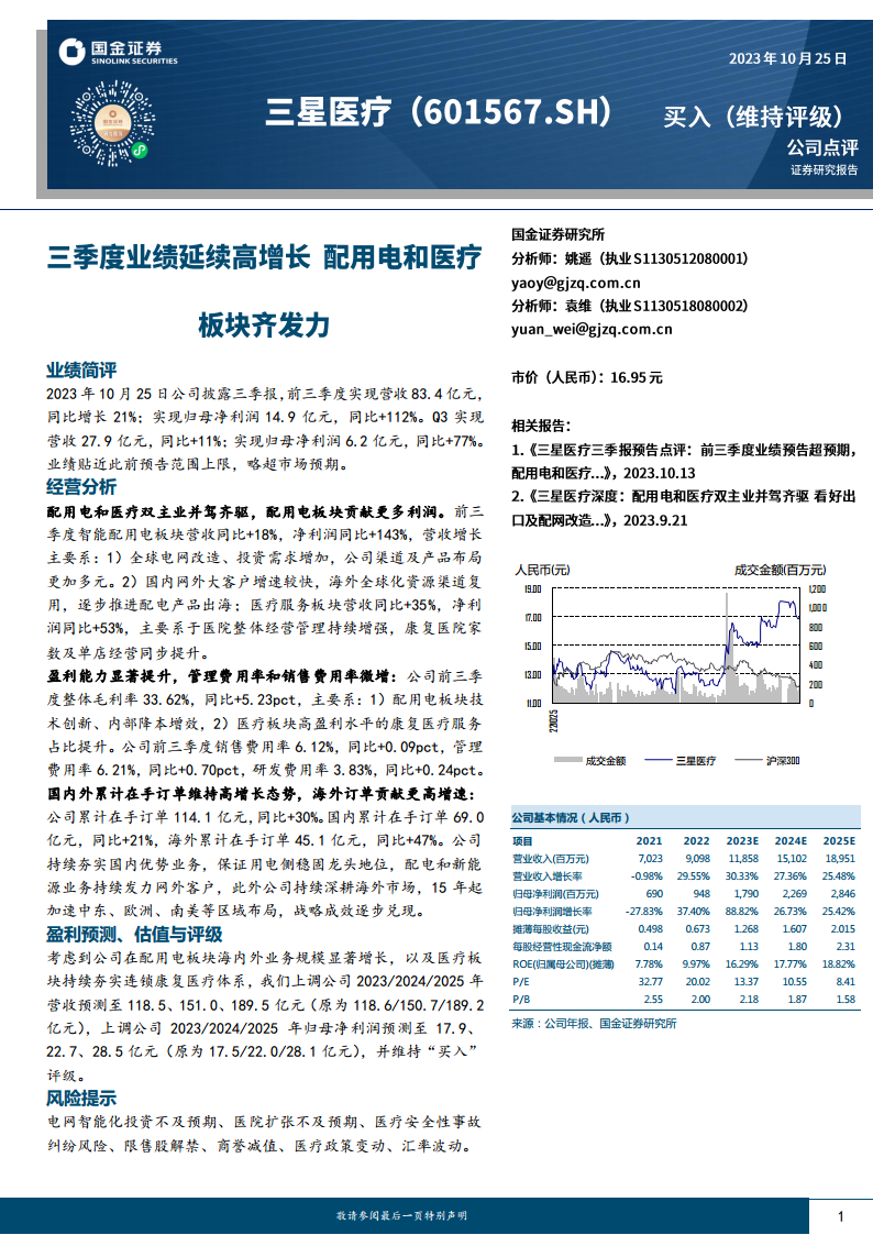 综上所述,三星医疗在2023年前三季度展现出卓越的经营韧性和增长潜力。公司通过智能配用电和医疗服务双主业的协同发展,实现了营收和归母净利润的显著增长,特别是归母净利润同比翻番,超出市场预期。盈利能力的提升得益于技术创新、成本控制以及高盈利业务占比的优化。同时,公司在国内外市场均取得了丰硕成果,尤其海外订单的高速增长,验证了其全球化战略的有效性。尽管面临电网投资、医院扩张、政策变动和汇率波动等多重风险,但鉴于其强劲的业绩表现、稳健的业务布局和积极的市场拓展,分析师上调了盈利预测并维持“买入”评级,表明对公司未来发展的持续看好。