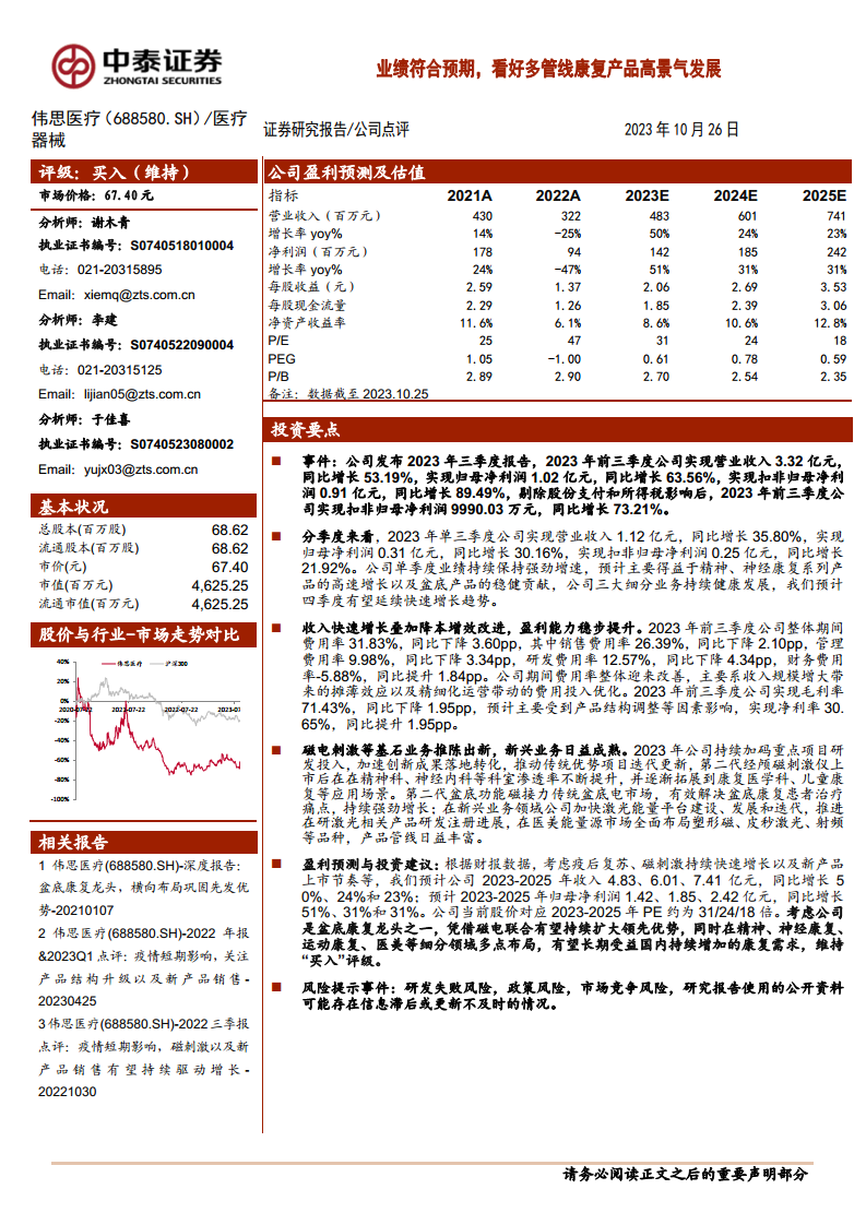 伟思医疗2023年前三季度业绩表现出色,营业收入和归母净利润均实现高速增长,主要得益于精神、神经康复及盆底产品的强劲表现。公司通过有效的降本增效措施,期间费用率显著下降,推动盈利能力稳步提升。在产品创新方面,第二代经颅磁刺激仪和盆底功能磁产品市场渗透率不断提高,同时公司积极布局激光能量平台和医美市场,丰富了产品管线。分析师基于公司疫后复苏、磁刺激业务增长及新产品上市的预期,维持“买入”评级,看好公司在康复医疗市场中的长期增长潜力,但同时提示了研发、政策和市场竞争等潜在风险。