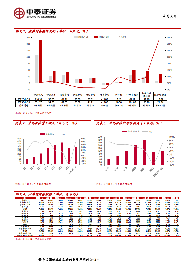 伟思医疗2023年前三季度实现营业收入3.32亿元,同比增长53.19%;归母净利润1.02亿元,同比增长63.56%;扣非归母净利润0.91亿元,同比增长89.49%。剔除股份支付和所得税影响后,扣非归母净利润为9990.03万元,同比增长73.21%。 就单季度而言,2023年第三季度公司实现营业收入1.12亿元,同比增长35.80%;归母净利润0.31亿元,同比增长30.16%;扣非归母净利润0.25亿元,同比增长21.92%。公司单季度业绩持续保持强劲增速,预计主要驱动因素为精神、神经康复系列产品的高速增长以及盆底产品的稳健贡献。