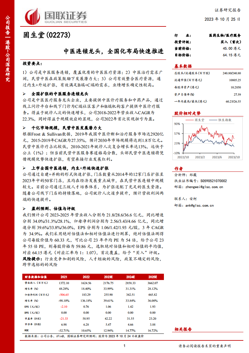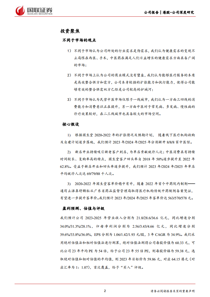 公司近年来实现了显著的业绩增长和盈利能力提升,2018-2022年营业收入复合年增长率达22.03%,并于2022年首次实现扭亏为盈。未来,随着门店数量的持续增加、单店就诊人次的提升以及客单价的稳中有升,预计公司营收和归母净利润将保持高速增长。基于对公司商业模式的成熟性、扩张速度的稀缺性及高成长性的判断,本报告首次覆盖固生堂并给予“买入”评级,目标价格为64.15港元,体现了对其未来发展前景的积极预期。