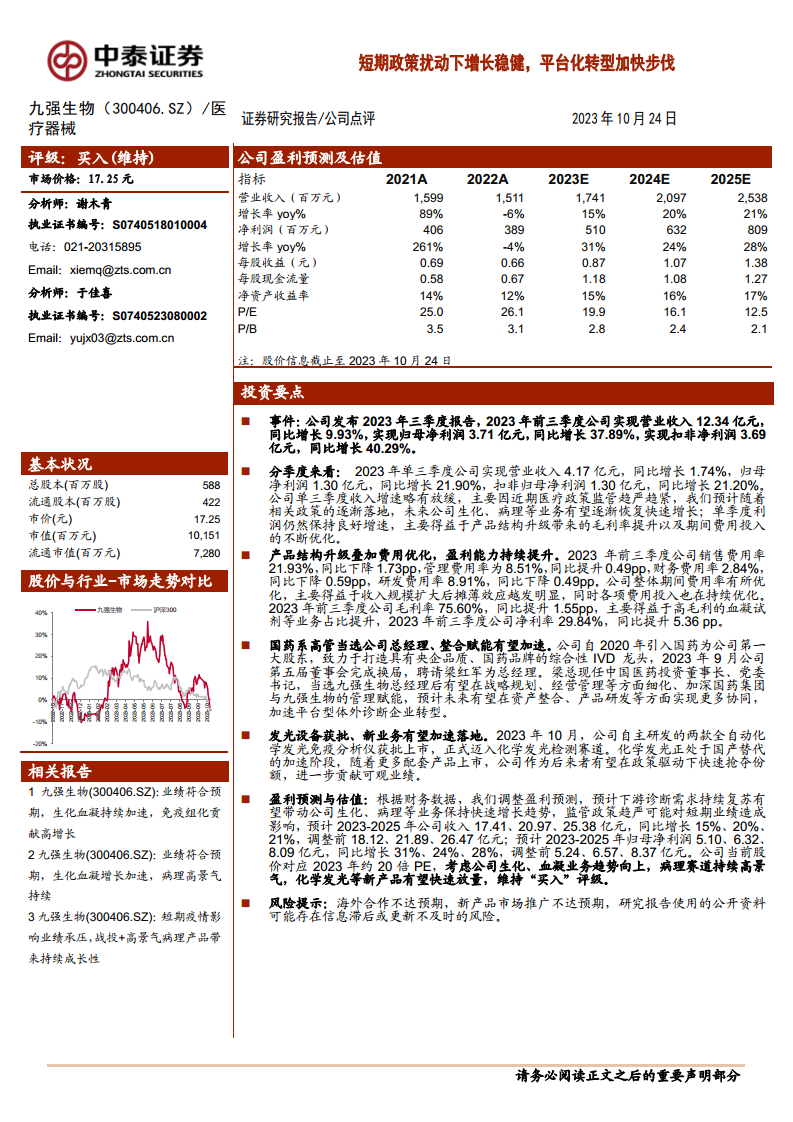 基于对公司财务数据和未来发展趋势的综合分析,报告对九强生物的盈利预测进行了调整。预计2023年至2025年,公司营业收入将分别达到17.41亿元、20.97亿元和25.38亿元,同比增长率分别为15%、20%和21%(调整前预测为18.12亿元、21.89亿元、26.47亿元)。归属于母公司股东的净利润预计将分别达到5.10亿元、6.32亿元和8.09亿元,同比增长率分别为31%、24%和28%(调整前预测为5.24亿元、6.57亿元、8.37亿元)。尽管预测数据略有下调,但公司当前股价(17.25元,截至2023年10月24日)对应2023年约20倍的市盈率(P/E)。考虑到公司生化、血凝业务的良好发展趋势,病理赛道的持续高景气,以及化学发光等新产品有望快速放量,报告维持对九强生物的“买入”评级。同时,报告也提示了海外合作不达预期、新产品市场推广不达预期以及研究报告使用的公开资料可能存在信息滞后或更新不及时的风险。