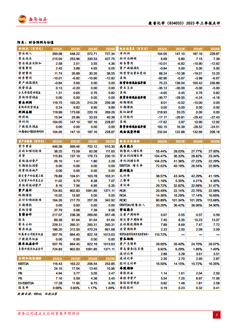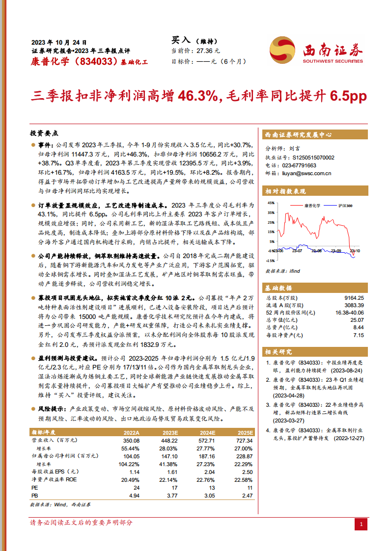 康普化学在2023年前三季度表现出色,营收和净利润实现高速增长,特别是扣非净利润同比高增46.3%,彰显了其核心业务的强劲盈利能力。这主要得益于市场订单的增加、规模效应的显现以及新湿法萃取工艺带来的制造成本降低。公司通过募投项目扩大产能并加强研发投入,进一步巩固了其在金属萃取剂领域的龙头地位,以应对新能源产业链和湿法冶炼工艺发展带来的持续市场需求。同时,公司计划实施首次季度分红,积极回馈股东。尽管面临产业政策、市场、原材料价格等风险,但基于其稳健的财务表现、清晰的增长战略和行业领先地位,预计公司未来业绩将持续向好,维持“买入”投资评级。