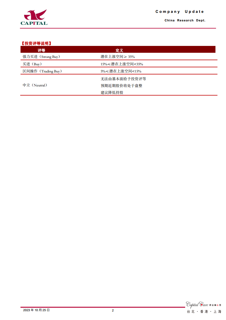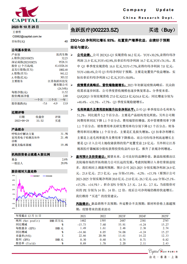 2023年初新冠疫情高峰过后,民众防疫需求逐步回落,公司季度营收规模恢复常态。分季度来看,Q1/Q2/Q3营收分别为27.0亿元/22.8亿元/16.8亿元,同比增速分别为+48.4%、+31.5%、+7.7%,显示出稳健的增长态势。第三季度单季综合毛利率达到51.2%,同比提升5.2个百分点,主要系产品结构变化所致。同时,公司期间费用率同比下降1.1个百分点,费用管控能力增强,其中管理费用率、销售费用率及研发费用率均有所下降。这些因素共同推动了扣非净利润的增长。展望未来,公司凭借良好的品牌价值、新品陆续推出以及院端市场的开拓,有望实现长远发展。考虑到短期内计入较多非经常性损益,分析师相应上调了盈利预测,预计2023-2025年净利润分别为24.9亿元、23.8亿元、27.5亿元,折合EPS分别为2.5元、2.4元、2.7元。当前股价对应的PE分别为14倍、14倍、12倍。分析师维持“买进”的投资建议,目标价40元,认为疫后公司净利端仍将维持快速增长。报告同时提示了新品销售不及预期、外延整合不及预期、原材料价格上涨超预期以及疫情带来的需求波动等风险。