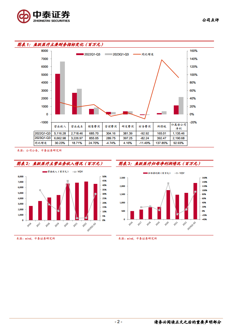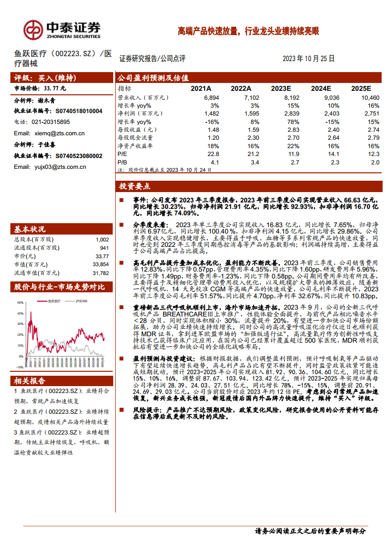 鱼跃医疗在2023年前三季度表现出卓越的财务业绩,营业收入和归母净利润均实现显著增长,尤其在第三季度,归母净利润同比翻番。这一强劲增长主要得益于公司呼吸、血糖等核心常规产品的快速放量,以及新一代呼吸机、14天免校准CGM等高端产品的成功市场渗透。公司通过精细化管理有效控制了各项期间费用,同时高端产品占比的提升显著改善了毛利率和净利率,显示出其盈利能力的持续增强。此外,全新三代呼吸机的成功上市和高流量呼吸湿化治疗仪获得MDR认证,不仅巩固了公司在国内市场的领先地位,也为其加速全球化战略布局提供了有力支撑。尽管存在产品推广不及预期和政策变化等风险,但鉴于公司常规业务的加速恢复、新兴业务的强劲成长性以及品牌力的持续提升,分析师维持了对鱼跃医疗的“买入”评级。