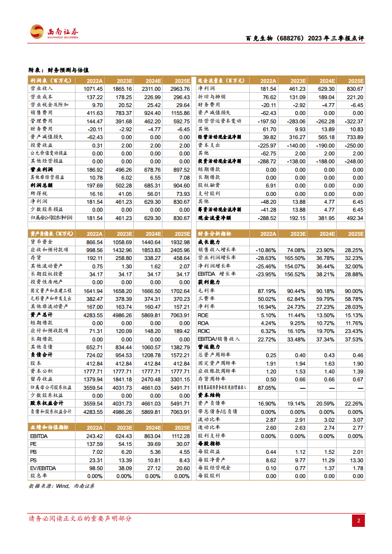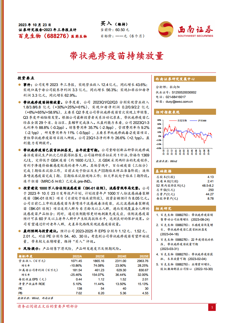 中心思想 带状疱疹疫苗驱动业绩强劲增长 百克生物2023年第三季度业绩表现卓越,营业收入和归母净利润均实现显著增长,核心驱动力在于带状疱疹疫苗的成功上市与持续放量。该疫苗在全国范围内的市场准入进展顺利,并凭借其差异化的接种方案和价格策略,有效提升了市场渗透率和公司整体盈利能力。 多元化管线布局与未来增长潜力 公司不仅在现有核心产品上取得突破,更积极布局多元化疫苗研发管线,包括百白破疫苗、流感疫苗及狂犬单抗等,展现出强大的创新能力和长期发展潜力。特别是对佐剂流感疫苗项目的战略投资,旨在拓宽产品覆盖人群,形成差异化竞争优势,为公司未来业绩增长奠定坚实基础。 主要内容 2023年三季报业绩表现与核心驱动 整体财务表现强劲: 2023年前三季度,百克生物实现营业收入12.4亿元,同比大幅增长43.6%。归属于母公司股东的净利润达到3.3亿元,同比增长56.3%。扣除非经常性损益后归母净利润为3.3亿元,同比增长62.9%,表明公司核心业务盈利能力显著增强。 季度业绩持续攀升: 分季度来看,公司业绩呈现加速增长态势。2023年Q1/Q2/Q3分别实现营业收入1.8/3.8/6.8亿元,同比增速分别为30%/25%/61%。同期归母净利润分别为0.2/0.9/2.2亿元,同比增速分别为6%/65%/58.9%。其中,Q2季度带状疱疹疫苗首次实现上市销售,Q3季度开始陆续发货,成为推动公司业绩增长的核心动力。 盈利能力稳健提升: 报告期内,公司盈利能力有所改善。前三季度毛利率为88.8%,与去年同期基本持平(-0.2个百分点)。销售费用率、管理费用率和研发费用率均有所下降,分别为35.7%(-2.9pp)、9.2%(-2.1pp)和11%(-0.5pp)。净利率提升2.1个百分点至26.6%,反映出公司在营收规模扩大的同时,对成本和费用控制的有效性。研发费用投入主要集中于单纯疱疹病毒-2疫苗项目和重组带状疱疹疫苗项目,体现了公司对未来创新的持续投入。 疫苗产品线进展及市场策略 带状疱疹疫苗市场准入与竞争优势: 公司重磅创新品种带状疱疹减毒活疫苗的试生产批次已获得批签发,为全年放量销售奠定基础。该疫苗已在全国29个省、自治区、直辖市完成准入,市场覆盖面广。在市场策略上,公司采用1针法接种程序,定价为1369元/支,低于竞品GSK疫苗(约1600元/支,且采用两针法免疫程序),这一差异化定价策略有利于渗透价格敏感度较高的老年人群市场,提升市场竞争力。 多元化研发管线稳步推进: 除了带状疱疹疫苗,公司其他研发管线也取得积极进展。百白破疫苗(三组分)已完成Ⅰ期临床试验工作,目前正处于验证及生产Ⅲ期临床样品准备阶段。液体鼻喷流感疫苗已完成Ⅰ期、Ⅱ期临床试验现场工作。狂犬单抗处于临床Ⅰ期阶段。冻干狂苗(MRC-5细胞)已完成pre-IND,显示公司在多个疫苗领域具备持续创新能力。 流感疫苗管线战略布局: 公司于2023年10月23日发布投产计划,拟投资8.05亿元建设年产1000万人份流感病毒裂解疫苗(BK-01佐剂)项目,目前处于临床前阶段。此举旨在完善流感疫苗产品组合,现有已上市产品为鼻喷冻干流感减毒活疫苗,而新的佐剂流感疫苗项目将适用于6月龄及以上人群,实现对全人群的覆盖。佐剂的使用能够更好地刺激免疫反应,预计可在60岁及以上老年人群中产生较高抗体水平,达到良好的保护效果,有助于公司通过针对老年人群的差异化路线实现流感疫苗放量。 盈利预测与投资建议: 基于带状疱疹疫苗的持续放量及其带来的业绩增量,分析师预计公司2023-2025年每股收益(EPS)分别为1.12元、1.52元、2.01元,对应市盈率(PE)分别为54倍、40倍、30倍。鉴于公司强劲的增长势头和产品管线潜力,报告维持“买入”评级。 风险提示: 报告提示投资者需关注产品销售下滑风险以及产品研发进度不及预期风险。 总结 百克生物2023年三季报业绩表现亮眼,营业收入和归母净利润均实现大幅增长,主要得益于带状疱疹疫苗的成功上市和持续放量。 公司在带状疱疹疫苗市场准入方面取得显著进展,并凭借差异化的定价策略,有望进一步扩大市场份额,尤其是在价格敏感度较高的老年人群中。 除了带状疱疹疫苗,公司还积极布局多元化疫苗管线,包括百白破疫苗、流感疫苗和狂犬单抗等,并通过投资佐剂流感疫苗项目,旨在覆盖更广泛人群并形成差异化竞争优势。 财务预测显示,未来几年公司业绩有望保持高速增长,盈利能力持续提升,为投资者带来可观回报。 综合来看,百克生物凭借其核心产品的市场潜力和丰富的研发管线,展现出良好的发展前景,因此维持“买入”评级,但投资者需关注产品销售和研发进度风险。