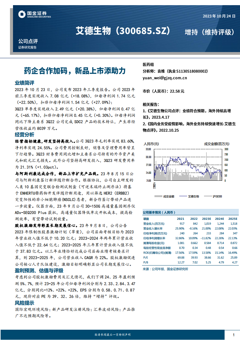 公司2023年前三季度在营收方面保持了稳健增长,尽管归母净利润受非经常性收益高基数影响而暂时性下降,但扣非归母净利润的显著增长表明核心业务表现强劲。公司经营指标健康,持续高研发投入,并通过与阿斯利康的战略合作、高通量测序仪的获批以及股权激励计划的实施,有效拓展了产品线,提升了市场竞争力,并坚定了长期发展信心。尽管分析师下调了未来两年的盈利预测,但基于公司稳健的经营策略和明确的增长目标,仍维持“增持”评级,同时提示了国际宏观、研发注册、汇率波动及产品推广等潜在风险。