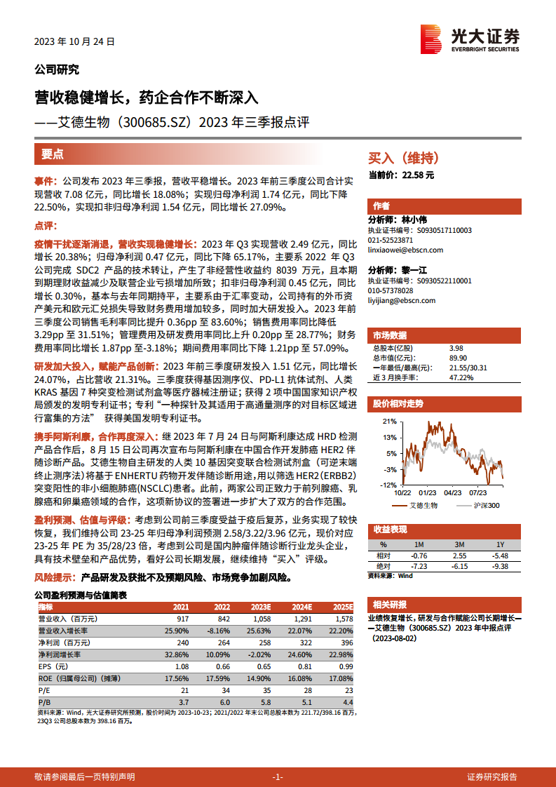 艾德生物(300685):营收稳健增长,药企合作不断深入