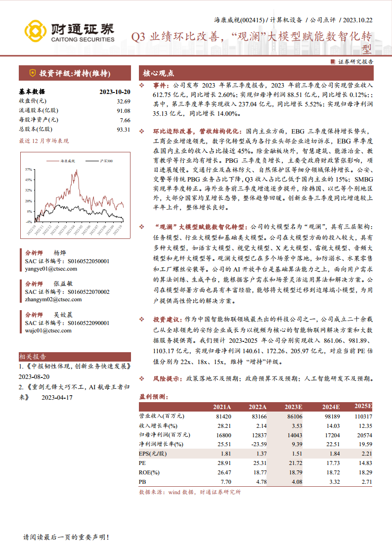 海康威视在2023年第三季度实现了业绩的环比改善,营收和归母净利润均实现同比增长,显示出公司在复杂市场环境下的经营韧性。公司通过优化业务结构,EBG和创新业务保持增长,海外业务逐步回暖,SMBG业务实现转正,有效对冲了PBG业务受政府财政影响带来的压力。更重要的是,公司在人工智能领域的前瞻性布局,特别是“观澜”大模型的推出及其在多场景的落地应用,为公司未来的数智化转型和增长提供了强劲动力。鉴于其领先的行业地位和稳健的盈利预测,财通证券维持对其“增持”评级,但同时提示了政策、政府预算及人工智能研发等潜在风险。