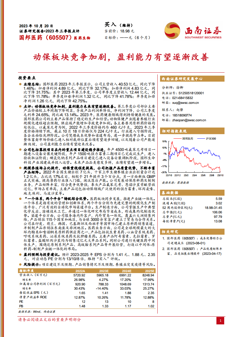 西南证券对国邦医药的盈利能力进行了预测。预计2023-2025年,公司每股收益(EPS)分别为1.41元、1.88元和2.35元,对应的动态市盈率(PE)分别为13倍、10倍和8倍。