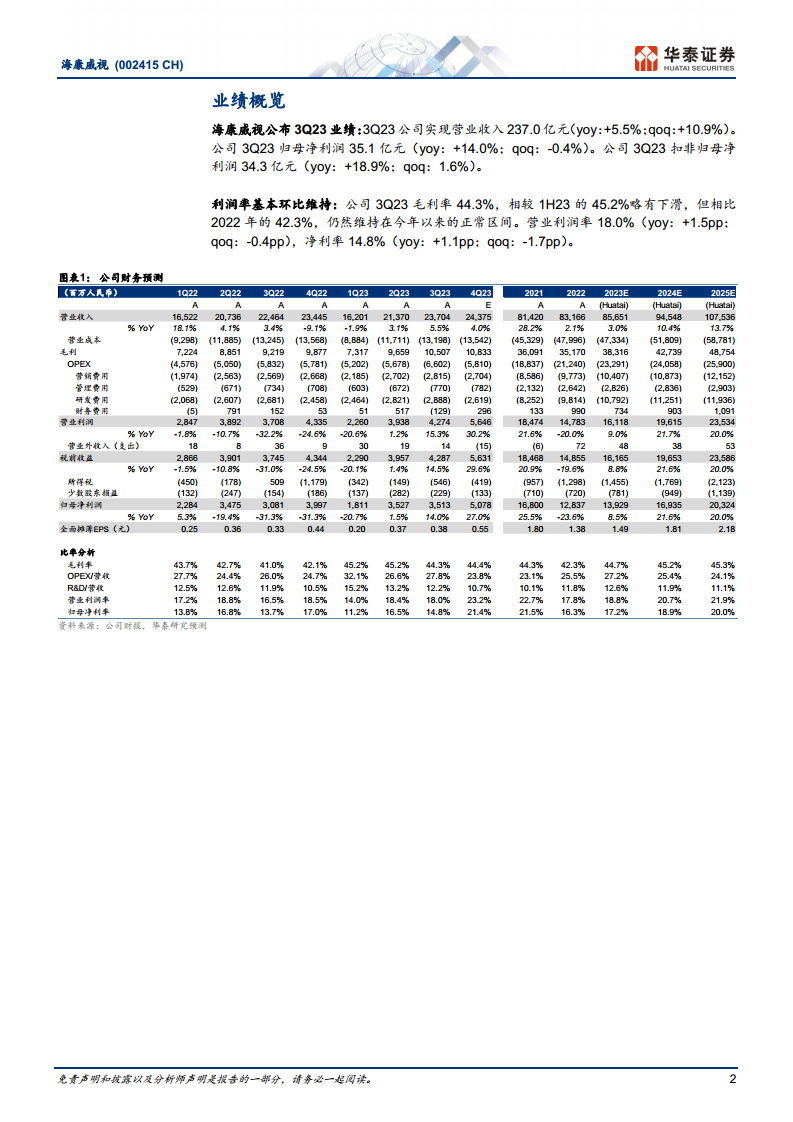 海康威视在2023年第三季度实现了稳健的财务增长,但增速有所放缓。报告期内,公司实现营业收入237.0亿元人民币,同比增长5.5%;归属于上市公司股东的净利润为35.1亿元人民币,同比增长14.0%;扣除非经常性损益后归属于上市公司股东的净利润为34.3亿元人民币,同比增长18.9%。 从盈利能力来看,公司3Q23的毛利率为44.3%,相较于2023年上半年的45.2%略有下滑,但仍高于2022年全年的42.3%,显示出公司在成本控制和产品定价方面的相对稳定性。营业利润率为18.0%(同比提升1.5个百分点,环比下降0.4个百分点),净利率为14.8%(同比提升1.1个百分点,环比下降1.7个百分点),整体利润率水平基本保持稳定。