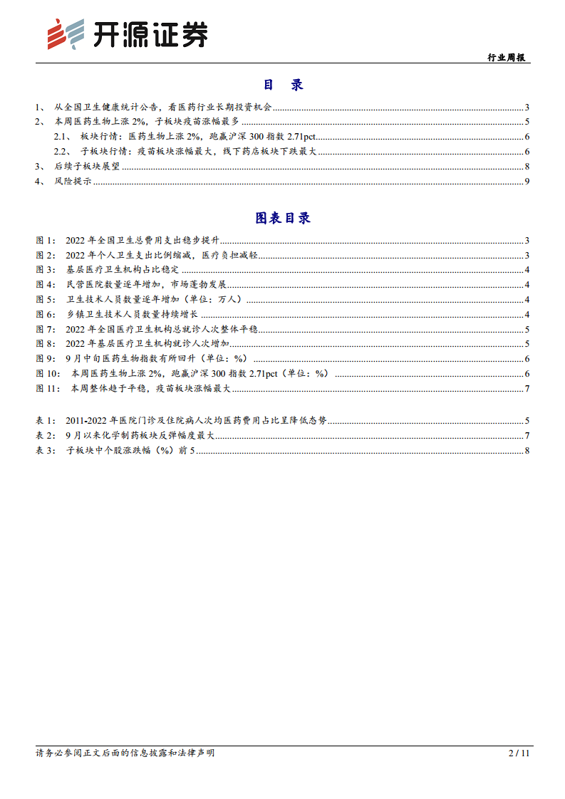 本报告基于2022年全国卫生健康统计公报,深入分析了中国医药行业的投资机会。数据显示,卫生总费用稳步增长,医疗市场持续扩容。在医疗资源结构上,民营医院和基层医疗机构数量持续增加,卫生技术人员队伍壮大,医疗服务逐步下沉。受集采和医保谈判等政策影响,药占比呈下降趋势,处方药外流,院外医药市场展现出长期增长潜力。本周医药生物板块整体上涨,疫苗、原料药和医疗研发外包表现突出。展望未来,创新药及产业链、医疗设备及高值耗材、中药、医疗服务和零售药店等细分领域均存在结构性投资机会,但需警惕政策执行不及预期及行业黑天鹅事件等风险。