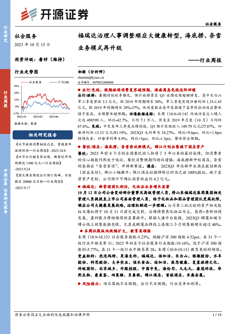 本报告深入分析了2023年第三季度社会服务行业的市场动态与关键数据,揭示了行业在整体复苏背景下的结构性分化与新兴机遇。核心观点包括:出行与旅游板块在暑期旺季的强劲复苏,尤其体现在旅游景区业绩的超预期增长和免税业务的边际改善;餐饮与酒店行业在宏观消费谨慎的背景下,通过模式创新和资产优化寻求增长;福瑞达等特定公司凭借管理层调整和核心业务(化妆品)的显著增长,展现出强劲的盈利能力提升潜力;同时,社会服务板块整体市场表现承压,但教育等细分领域呈现领涨态势。