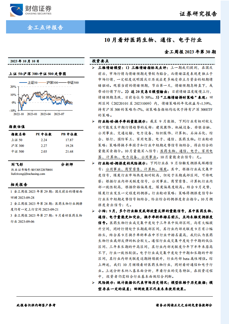 10月看好医药生物、通信、电子行业