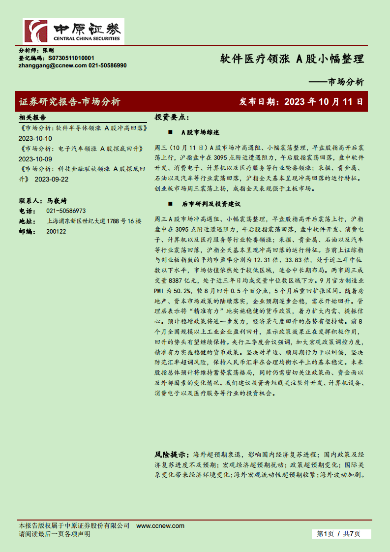 本报告对2023年10月11日A股市场进行了专业分析,指出市场在冲高遇阻后呈现小幅震荡整理,但内部结构性分化明显,科技与医疗相关板块表现强劲,领涨市场。宏观经济层面,9月制造业PMI重回扩张区间,企业预期和需求逐步回升,配合稳健的货币政策和积极的稳增长措施,为市场提供了企稳回升的宏观基础。当前市场估值处于近三年中位数以下水平,具备中长期布局价值。报告建议投资者短期内可关注软件开发、计算机设备、消费电子和医疗服务等行业的投资机会,同时提示了海外衰退、国内政策及经济复苏不及预期等潜在风险。
