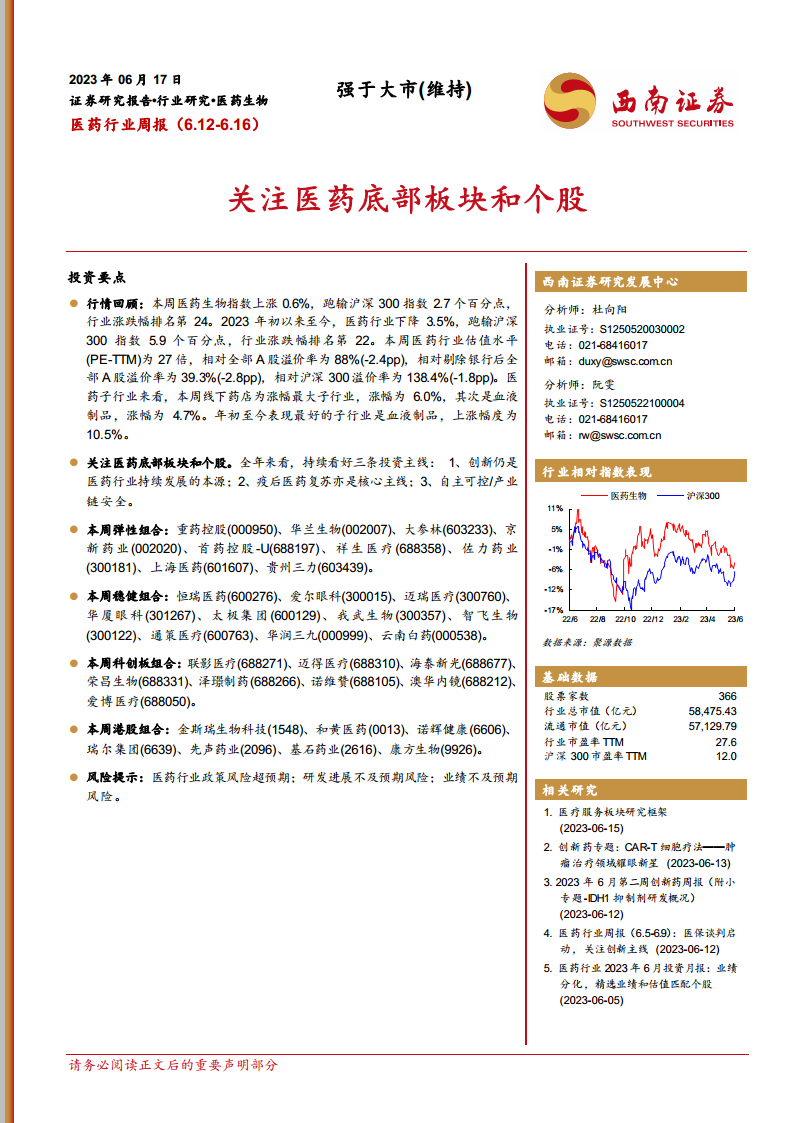报告强调,在当前市场环境下,应持续关注医药行业的底部板块和个股。全年投资策略聚焦三大核心主线:一是创新,作为医药行业持续发展的根本动力;二是疫后医药复苏,抓住疫情后医疗需求恢复带来的增长机遇;三是自主可控/产业链安全,强调国家战略背景下的国产替代和供应链韧性。报告还提供了弹性、稳健、科创板和港股四大组合,以期在不同风险偏好下捕捉投资机会。
