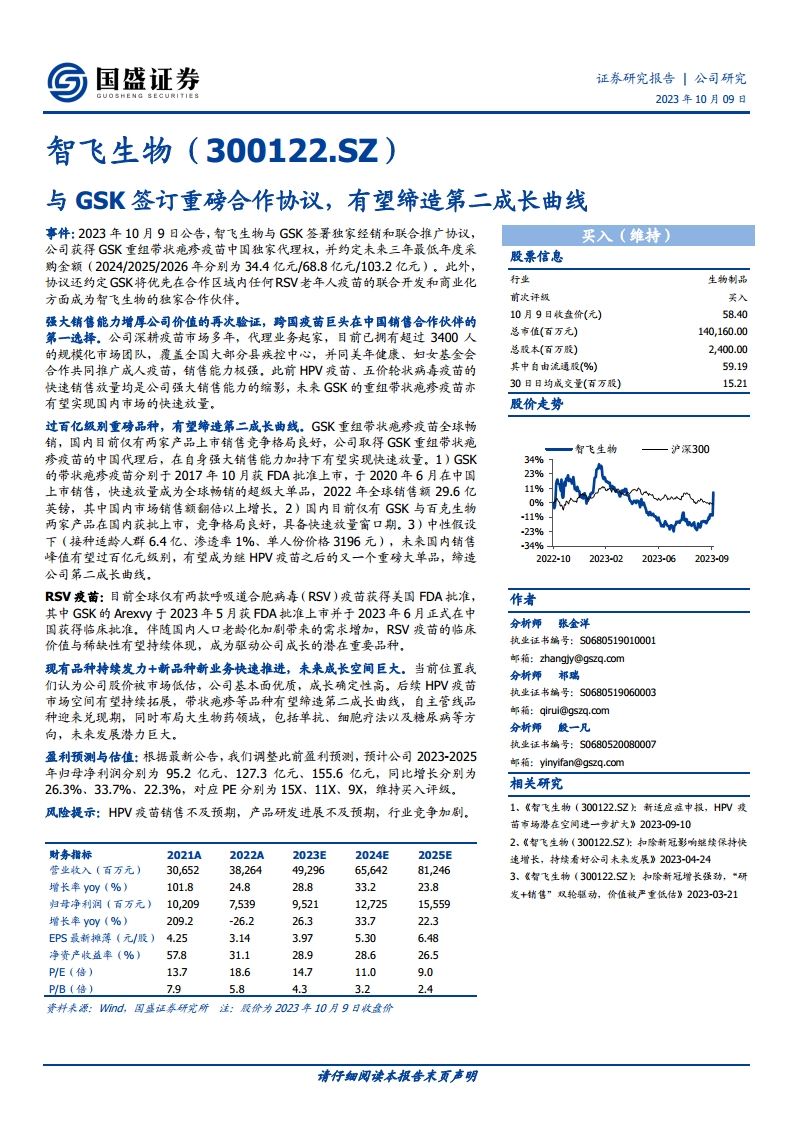 智飞生物与GSK签订的重磅合作协议,特别是获得重组带状疱疹疫苗的中国独家代理权,以及未来三年超百亿的最低采购金额,是公司强大销售能力的再次验证,并有望成为继HPV疫苗之后的又一核心增长引擎,缔造公司的第二成长曲线。国内带状疱疹疫苗市场潜力巨大,预计销售峰值可达百亿元级别。此外,RSV疫苗的潜在合作也为公司提供了长期增长机遇。结合现有品种的持续发力、自主管线品种的兑现以及在大生物药领域的战略布局,智飞生物未来成长空间广阔。国盛证券上调了公司盈利预测,并维持“买入”评级,但同时提示了销售、研发和竞争等方面的风险。