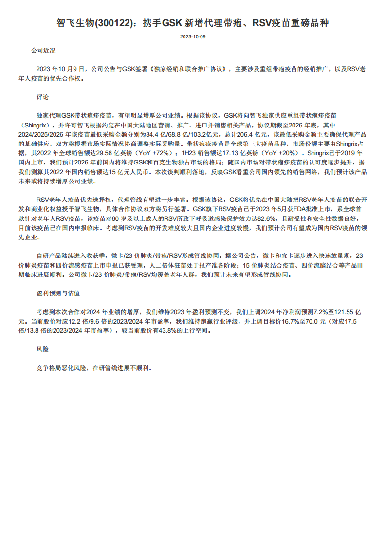 智飞生物(300122)携手GSK,新增代理带疱、RSV疫苗重磅品种