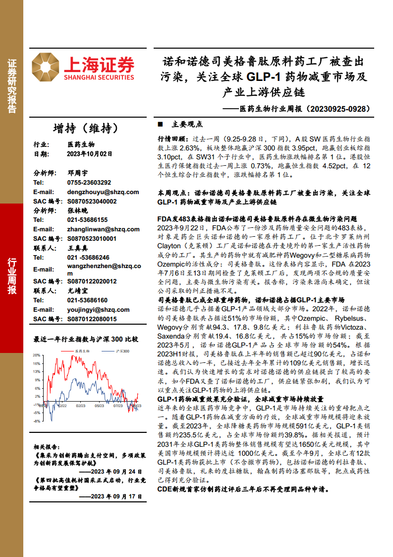 医药生物行业周报:诺和诺德司美格鲁肽原料药工厂被查出污染,关注全球GLP-1药物减重市场及产业上游供应链