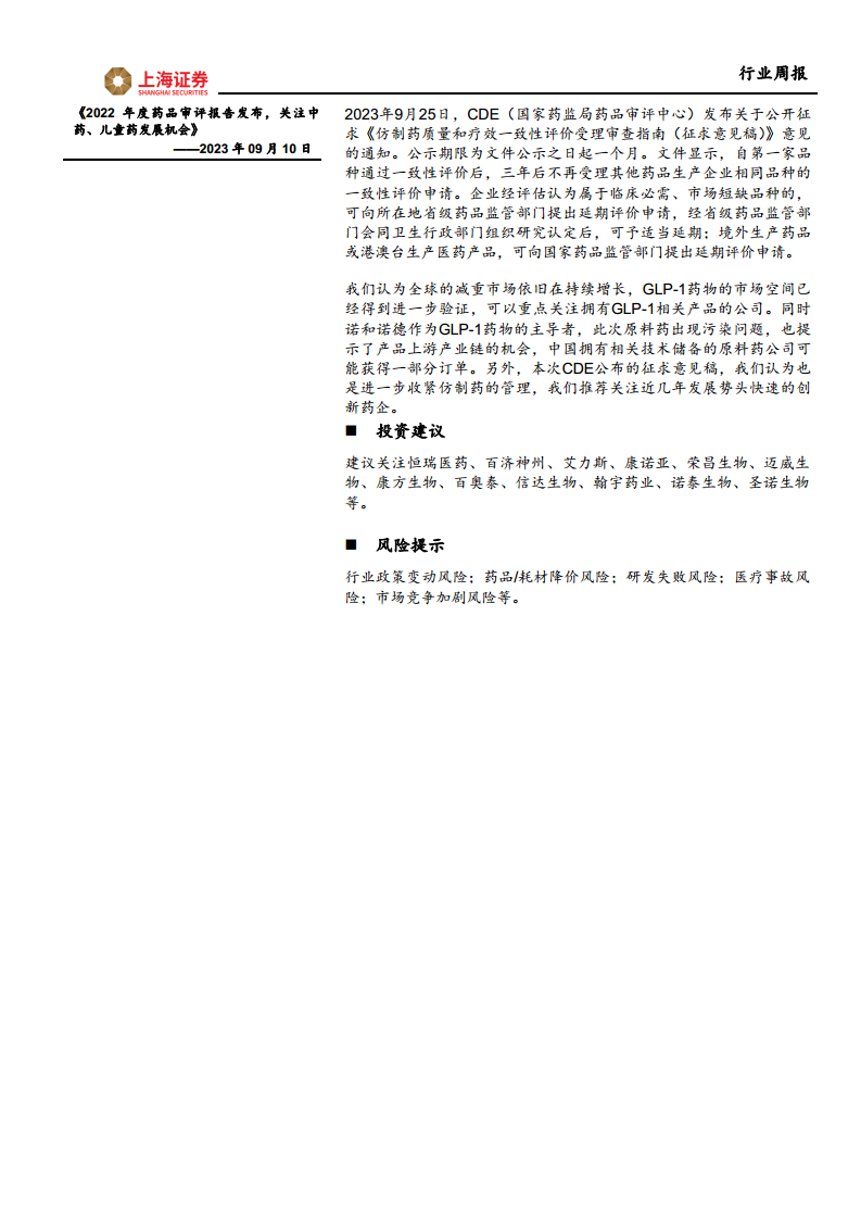 鉴于全球减重市场的持续增长和GLP-1药物市场空间的进一步验证,以及诺和诺德原料药污染事件所揭示的上游产业链机会,报告建议重点关注拥有GLP-1相关产品的公司、具备相关技术储备的中国原料药公司,以及在CDE新规下发展势头快速的创新药企。推荐关注的上市公司包括恒瑞医药、百济神州、艾力斯、康诺亚、荣昌生物、迈威生物、康方生物、百奥泰、信达生物、翰宇药业、诺泰生物、圣诺生物等。