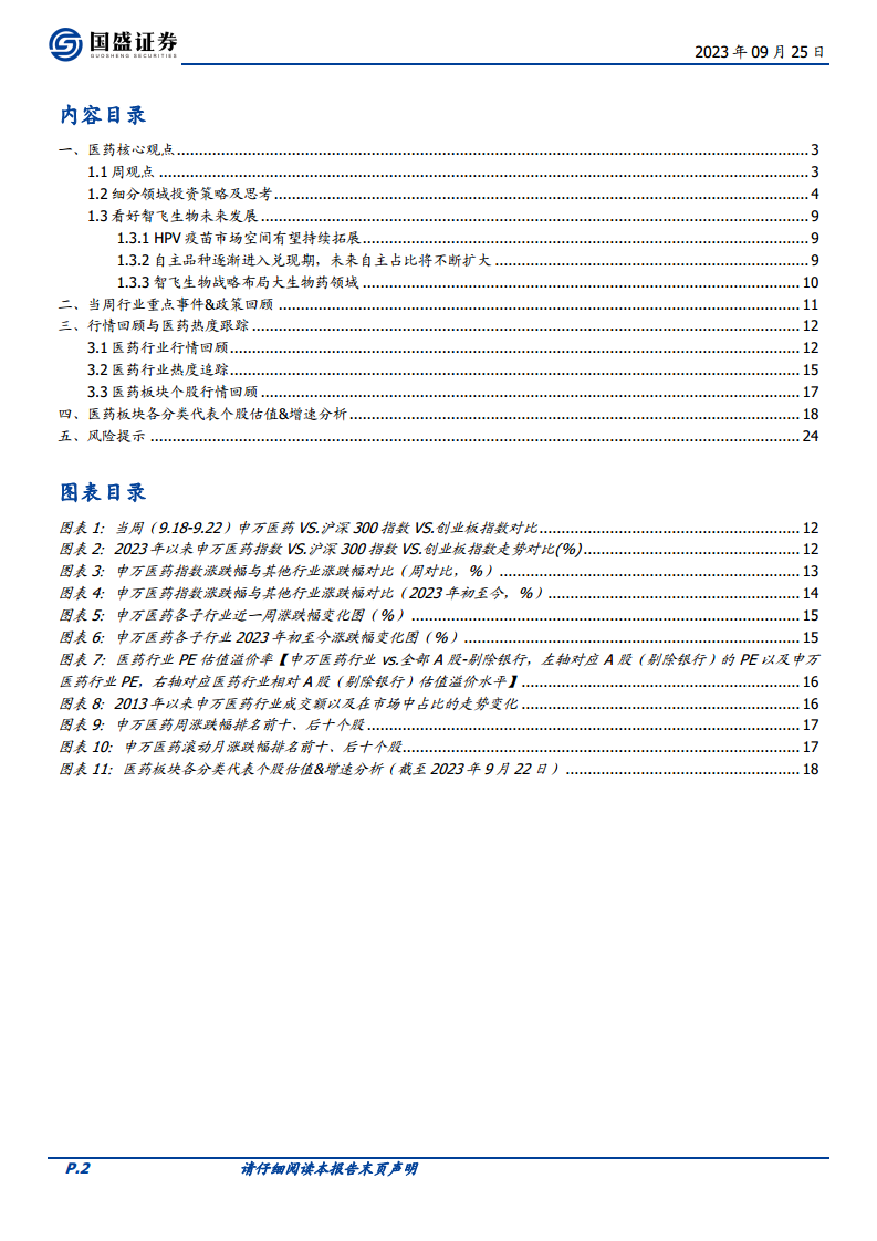 报告提供了截至2023年9月22日医药板块各分类代表个股的估值(PE)和归母净利润增速分析。该详细数据涵盖了创新药、仿制药、中药(创新、国改、基药、OTC、品牌)、疫苗、血制品、医疗器械(设备、高耗、低耗、IVD、制药装备、科研仪器设备、上游耗材试剂)、医疗服务以及配套领域(CDMO、CRO、原料药、药店、商业)等多个细分领域,为投资者提供了全面的参考依据,以支持其基于长期产业逻辑、个股变化逻辑、反腐修复和反腐免疫等策略进行配置。