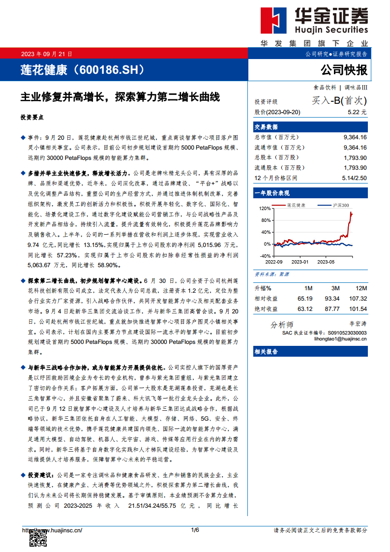 鉴于公司主业的快速恢复以及在健康产业、大消费等优势领域之外积极探索算力第二增长曲线的战略布局,华金证券首次覆盖并给予莲花健康“买入-B”的投资评级。