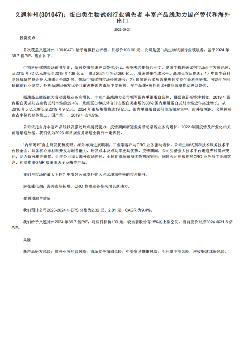 义翘神州作为蛋白类生物试剂行业的领先者,正受益于中国生物科研试剂市场的快速增长和进口替代趋势。公司凭借其丰富的产品线、强大的自主研发能力和全球化布局,展现出显著的市场竞争优势和持续的增长潜力。