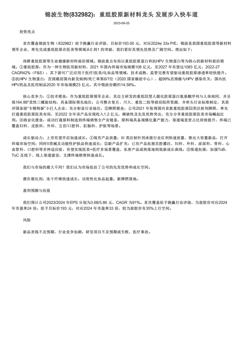 锦波生物作为我国重组胶原等生命健康新材料领域的领军企业,凭借其在重组胶原蛋白和抗HPV生物蛋白两大核心业务上的深厚积累,成功实现了重组胶原在医美等领域从0到1的突破。公司在重组胶原市场中占据有利地位,该市场预计将以42%的复合年增长率高速扩张,为公司未来业绩提供了坚实支撑。