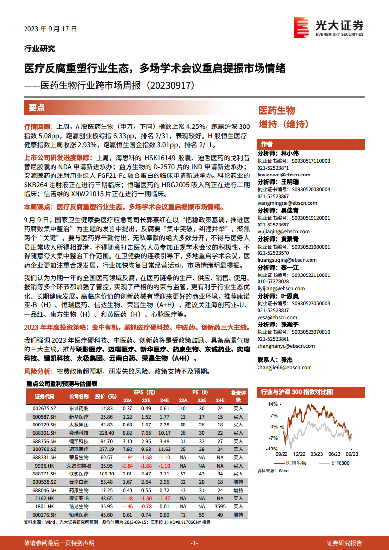 - 2023年年度投资策略: 强调2023年医疗硬科技、中医药、创新药将是受政策鼓励、具备高景气度的三大主线。推荐联影医疗、迈瑞医疗、新华医疗、药康生物、东诚药业、奕瑞科技、键凯科技、太极集团、云南白药、荣昌生物(A+H)。