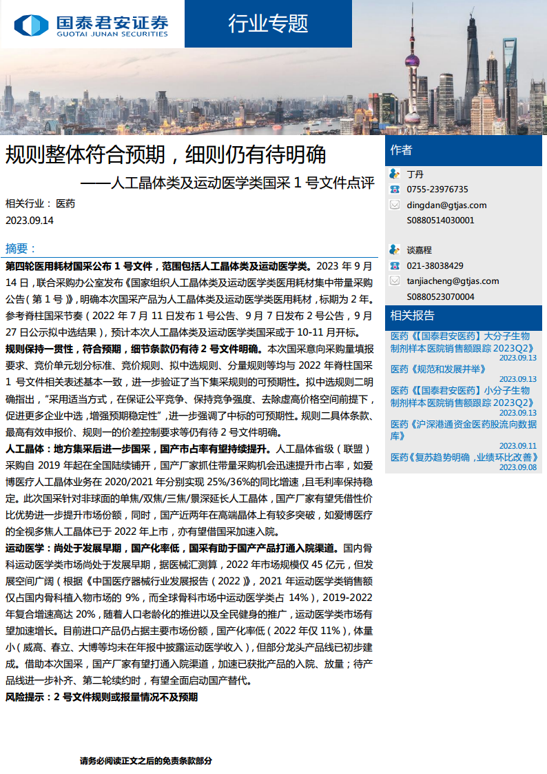 医药行业人工晶体类及运动医学类国采1号文件点评:规则整体符合预期,细则仍有待明确
