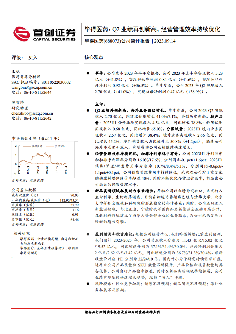 基于公司2023年上半年的优异表现和未来的战略布局,分析师对毕得医药的盈利预测进行了微调,并维持了“买入”